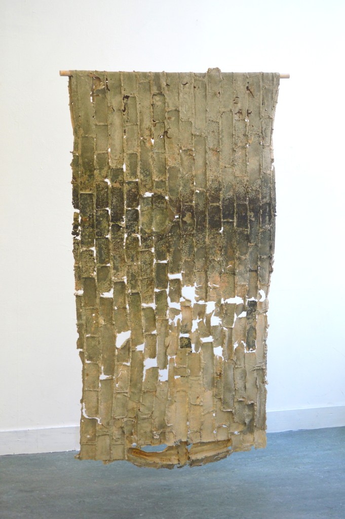 “Dovilė made wearable architecture. She glued rubber to floors, walls and other architectonic elements; the architecture functioned as a mould. Next, using the rubber, she created wearable objects such as a sash that can be draped around the shoulders. The objects also bear traces of the environmental surfaces to which the rubber was glued. Cracks in the floor are accentuated; dirt, stains, dust mites and footprints travel with the wearer like a second skin.